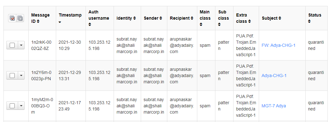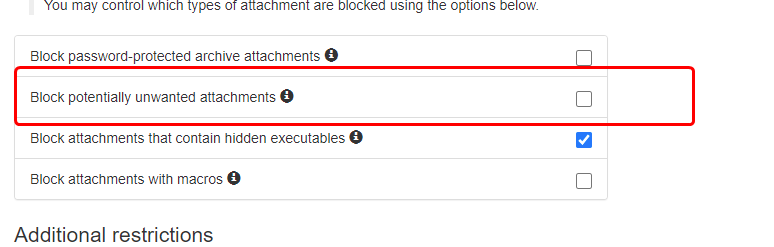 Troubleshooting Email quarantined for Extra class PUA.Pdf.Trojan.EmbeddedJavaScript-1DescriptionLogs show: IssueMails get quarantined due to attachments detected as PUA.Pdf.Trojan.EmbeddedJavaScript-1 SolutionLogin into the spam expert -> click on the Dashboard Scroll down t the right side click on the Attachment restrictions Uncheck Block potentially unwanted attachments and save it.