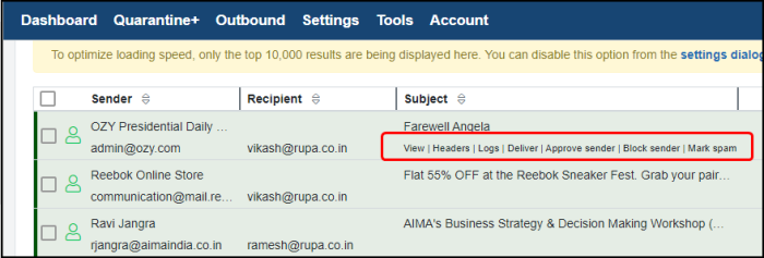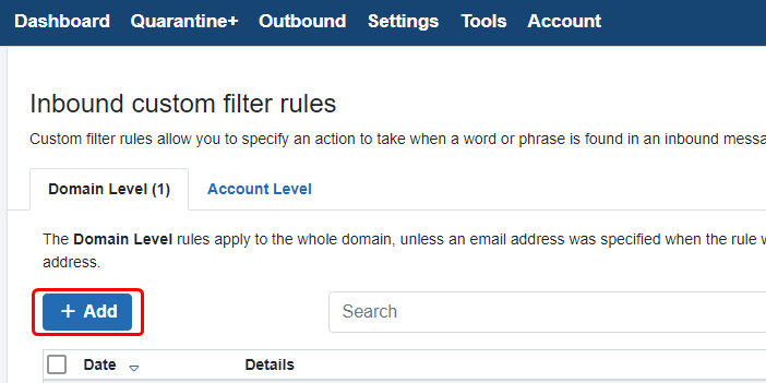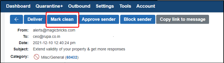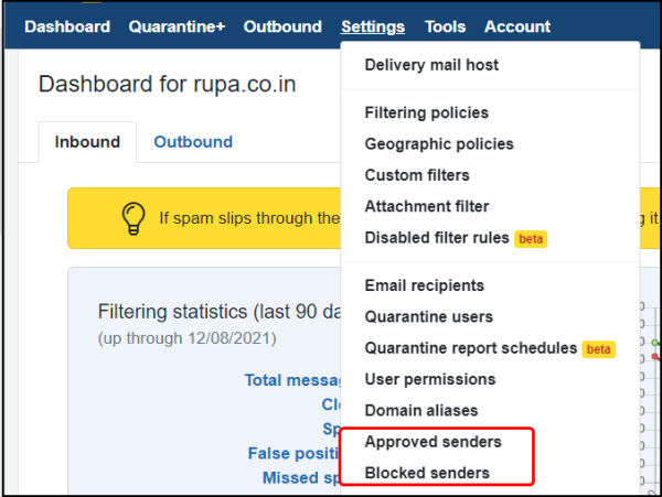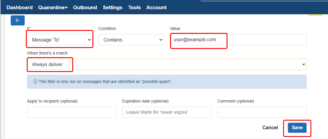 Click on the Mark clean Recipient White listCustom Filter rules that are set to "Always deliver" will override all other filters when there's a match. That includes messages with viruses, spoofed senders, blocked senders, and other Custom Filter rules that are set to "quarantine". Go to Settings > Custom Filter Then create a new filter rule. Create custom filter The highlighted parameters should be mentioned while creating the filter, where "[email protected]" is the recipient id where the incoming filter will not work and all incoming emails will always be allowed.