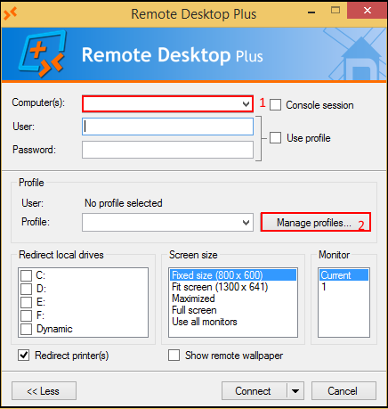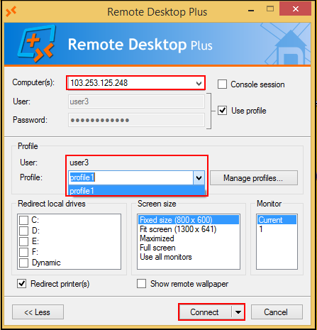 How to Connect Remote session with saved credentialsStep 1: Download the RDP Plus application from below mentioned URL:- https://www.donkz.nl/downloads/ Step 2: Follow the below mention steps 1. Type the IP address beside Computer(s) Text Box . 2. Click on Manage profile for creating a user login Profile Step 3: Now click on Add button for adding a profile. Step 4: Follow the below-mentioned steps for filling the detail 1. Provide the profile name beside Profile name: 2. Type the User name of your RDP user. 3. Type the password of RDP User. Step 5: Once Profile is created Put the IP address beside computer(S) then select the profile under profile section and then click on Connect. Now you will be able to connect to your Remote Desktop User Note: Once the above procedure is done then next time you just need to select the profile and then click on Connect.