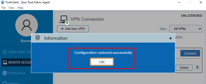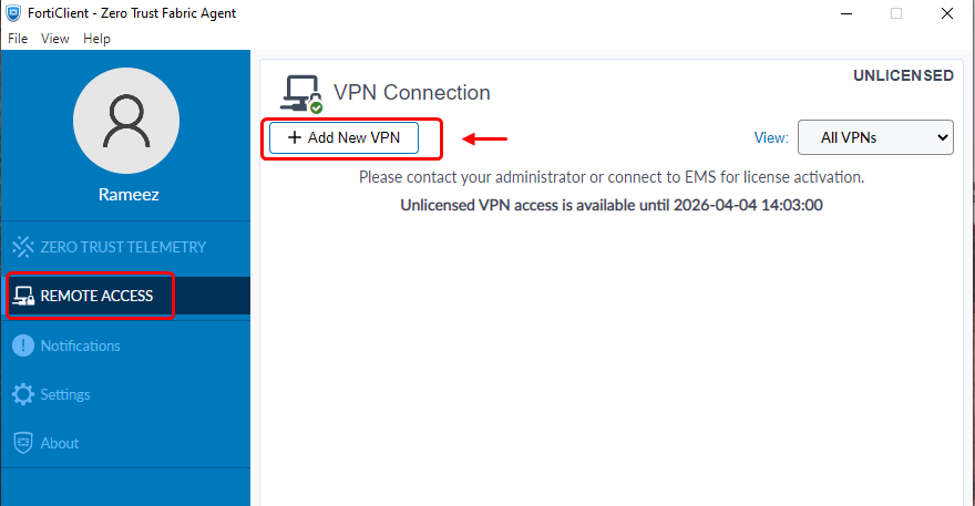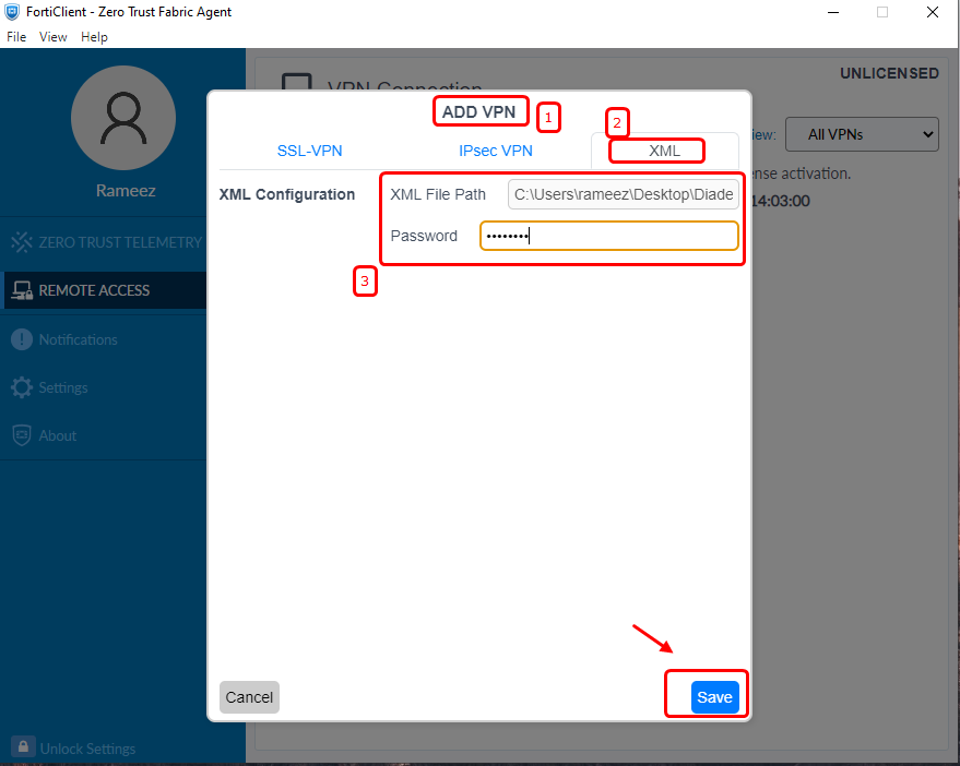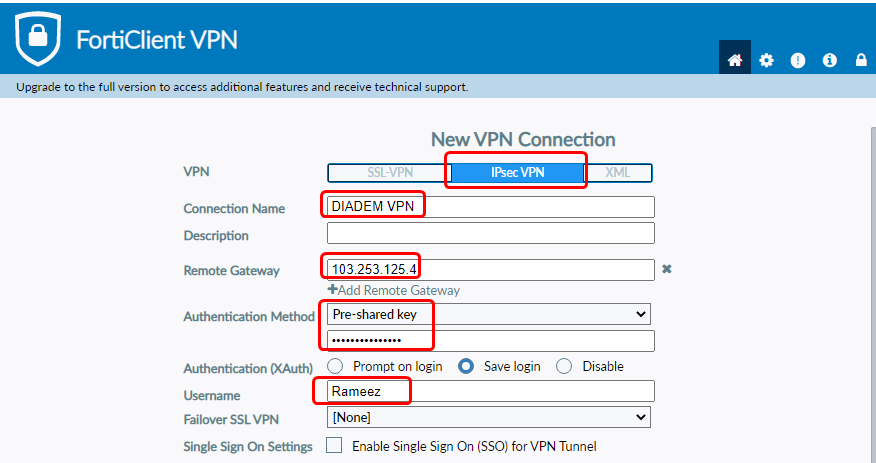 Installation is now completed. Launching the Fortinet VPN Client and Importing Configuration into VPNAfter Fortinet has been installed, you will see a new icon appear in the System tray or Desktop Icon. Click and open the same Step 01 : In the FortiClient REMOTE ACCESS section, click "Add New VPN" button at top right and select "Add New VPN" button. Step 02 : Import Configuration for IPSec VPN