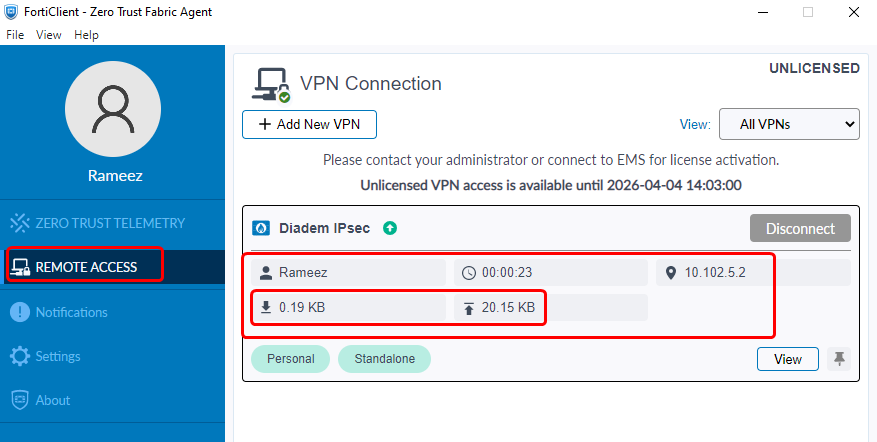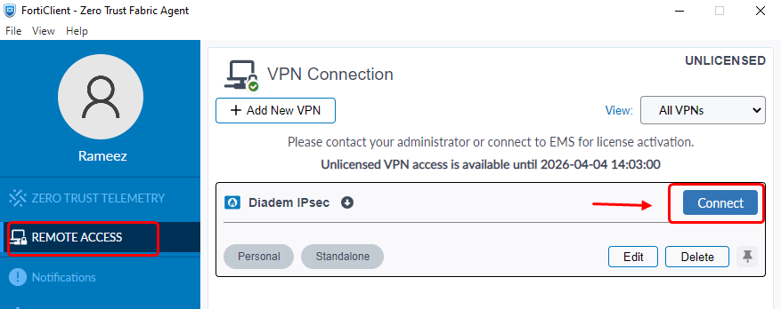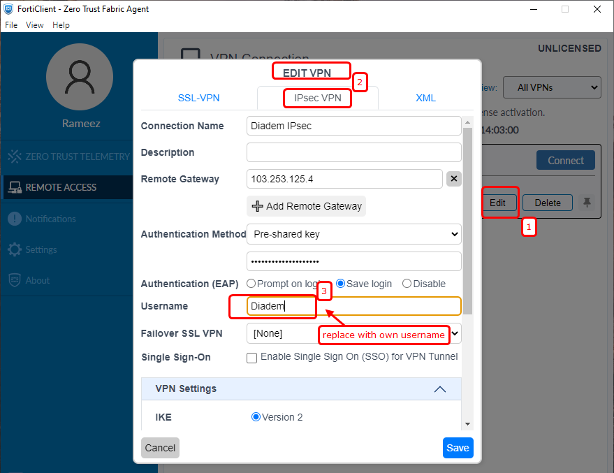 Import the configuration into the VPN and use password as 12345678, update the username with your own, and then proceed with the setup. The configuration file is attached in this KB for both Windows and MacOS; please check the Attachment tab. Step 03 : The username in the above configuration is set as Diadem. To access it using your own username, edit the imported VPN settings and replace the existing username with your username.