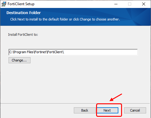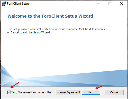 1. Installing the FortiClient software 2. Launching Fortinet VPN Client & Importing Configuration 3. FortiClient V7.x Manual Configuration Review (Optional) Installing the FortiClient software (Windows operating system 32bit/64bit) Download the appropriate version of the Fortinet VPN Client (FortiClient) from the links : https://www.fortinet.com/support/product-downloads#download-vpn-only Step 01 : Accept the "License Aement" and click Next. Step 02 : Click NEXT to Install to the default folder or click change to choose another destination for files to be saved, then Click NEXT to continue.