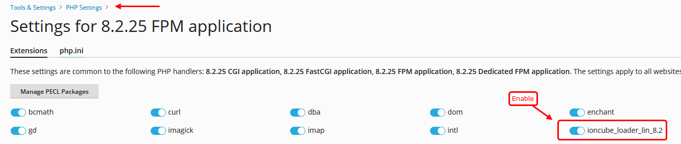 Step 3 : After Step 2, now Go to Tools & Settings > PHP Settings > click on any handler of necessary version (8.2 in the above example) and enable ioncube_loader_lin_X.X