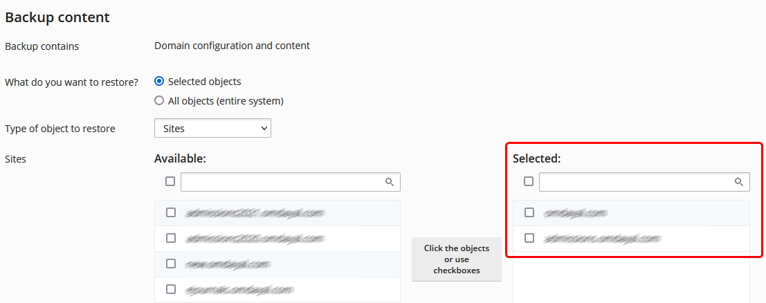 Step 5: For restoring the site's backup choose the 'Sites' option from the drop-down menu and select the sites which you want to be restored